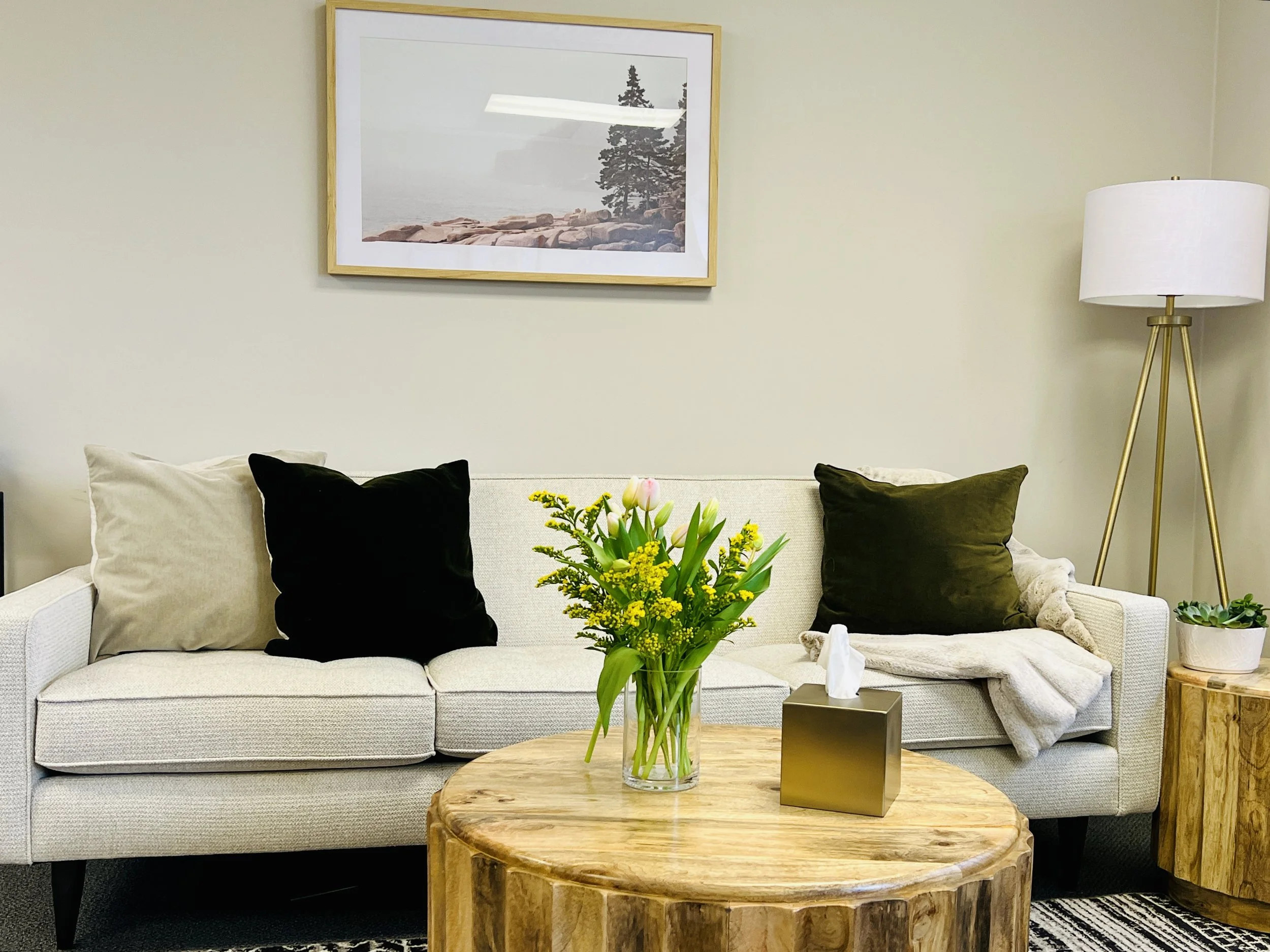 A space for building strong relationships: Our office aesthetic is relaxing to provide the space to focus on the therapeutic work with your relationship in mind. You’ll find comfortable seating, warm colors, and plenty of natural light with earthy plants to create a soothing environment.
